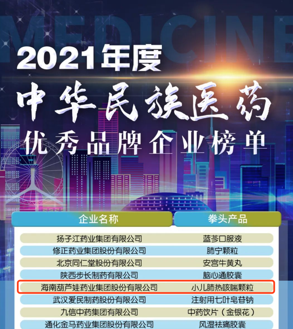 12月29日,全国工商联医药业商会发布了“2021年度中华民族医药优秀品牌企业榜单”,美狮贵宾会官网药业集团凭借黄金单品小儿肺热咳喘颗粒(4克)实力登榜。